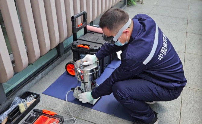 工作人员用粉碎机处理手机主板