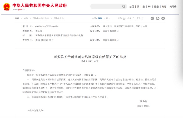 国务院关于新建黄岩岛国家级自然保护区的批复