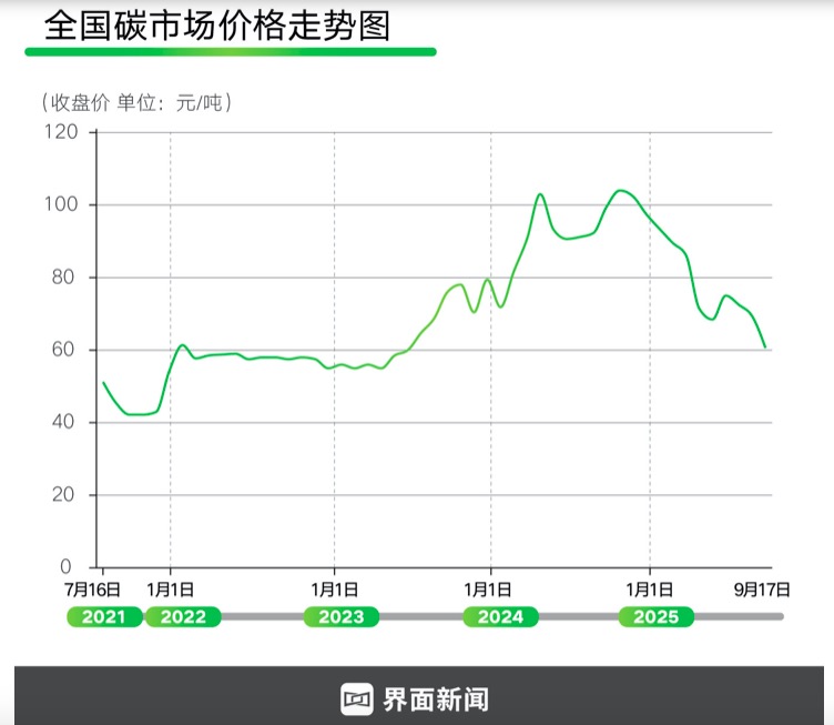 截至2024年底,碳市场累计成交量6.3亿吨,累计成交额430.33亿元。去年4月24日,全国碳市场收盘价为100.59元/吨,首次突破百元关口,较交易首日的开盘价48元/吨翻倍。之后最高收盘价达105.65元/吨。