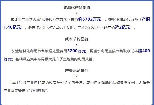 苏州循环经济产业园说:通过科学布局污水处理厂、污泥处置厂、有机废弃物(餐厨及厨余垃圾)利用厂、绿化垃圾利用厂、热电厂、天然气接收站等七大基础设施,形成各设施有机互联,互为能量和原料提供者、互为废弃物处理者的循环经济产业链。最终,可产生碳减排账、民生账、经济账“三本账”~