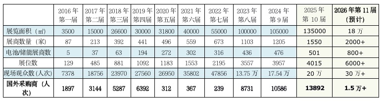 历届部分参展品牌企业包括:南方电网、宁德时代、比亚迪储能、华为数字能源、亿纬、国轩、天能、瑞普兰钧、中创新航、力神、赣锋、孚能、欣旺达、鹏辉、赛唯数字能源、永泰、科陆、三晶、易事特、多氟多、比克、冠宇、中科海钠、泰永长征、传艺钠电、东方旭能、品胜、森基、西清、虎头、超钠、南都、林洋、海四达、沃太、格力钛、科信、双登、巡鹰、海宝、振华、天科、德晋、德兰明海、移族创新、卡儿酷、阳光电源、隆基、盛宏、阿特斯、天合、美的、中兴、兴储世纪、汉能、晶科、英利、拓日新能、潞安、正泰、中天、国鸿氢能、氢蓝时代、亿华通、云韬、大族、星源材质等储能产业链品牌企业参展,历届共接待来了自全球100余个国家和地区的优质海外采购商超50,000余人次。