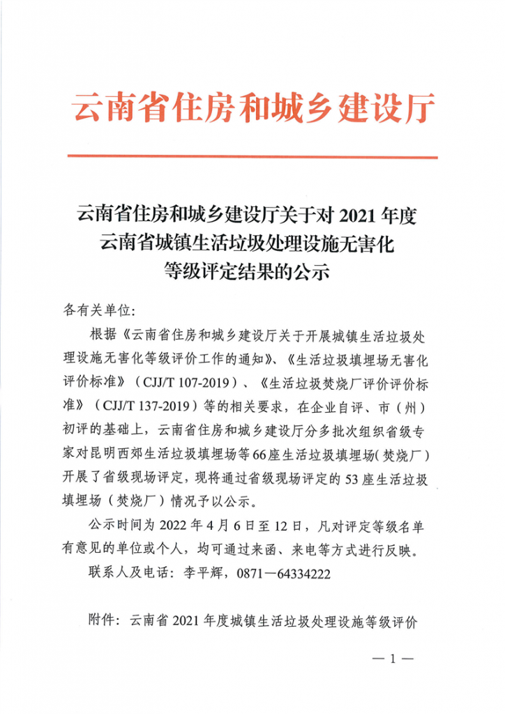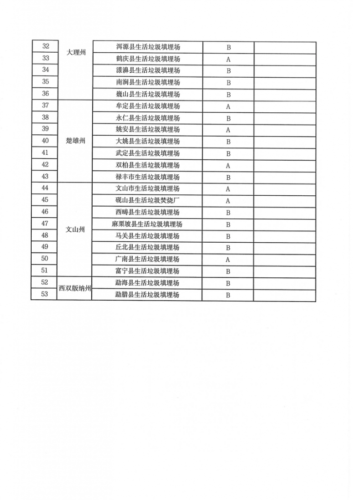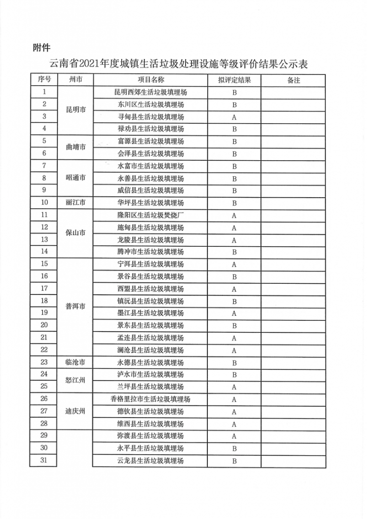 涉53座生活垃圾填埋场!云南省城镇无害化等级评定结果公示 作者: 边走边看 来源: 北极星环卫网 发布: 2022年4月9日 1189阅读 0评论 原标题:涉53座生活垃圾填埋场!2021年度云南省城镇生活垃圾处理设施无害化等级评定结果公示 日前,云南住建厅分多批次组织省级专家对昆明西郊生活垃圾填埋场等66座生活垃圾填埋场(焚烧厂)开展了省级现场评定,其中通过省级现场评定的合计53座。现将2021年度云南省城镇生活垃圾处理设施无害化等级评定结果公示如下: 北极星环卫网