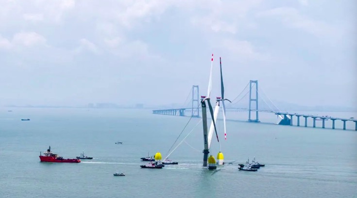 值得一提的是,“明阳天成号”实现了多项全球首创。其浮式基础为全球首次采用抗压能力达到115兆帕以上超高性能混凝土材料制造而成,这种混凝土材料强度达到普通混凝土的4倍左右。浮筒采用的“玻璃纤维外壳+XPS芯材+防护涂层材料”方案亦为世界首创,突破了传统浮筒采用纯钢结构或钢混结构的限制。此外,翼型双塔筒、双主机、双风轮的设计,以及拉索系统的应用均为全球首创。