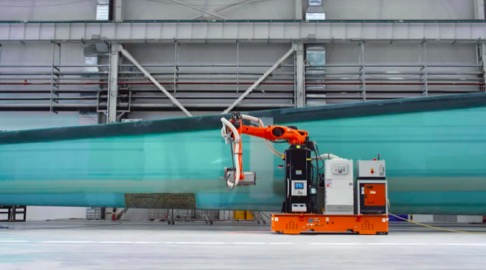 三一重能韶山叶片灯塔工厂采用机器人配合激光引导技术,实现叶片表面自动打磨、大面积自动喷漆,物料按需自动出库配送等诸多工序的无人化,在降低员工劳动强度的同时,将生产效率与质量管控提高到前所未有的高度。