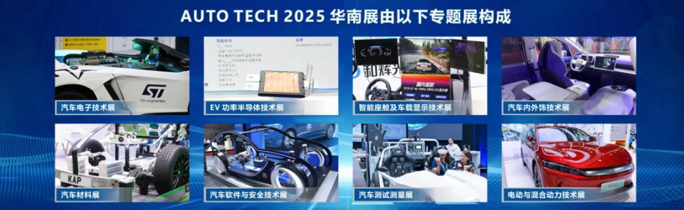 AUTO TECH China 2025 华南展聚焦汽车电动化与智能化技术革命,展品范围从电子芯片、材料、软件等单元,到车身、内外饰、智能座舱、底盘、智能驾驶、动力系统等部件,再到整车设计开发,覆盖汽车研发与生产的完整产业链。