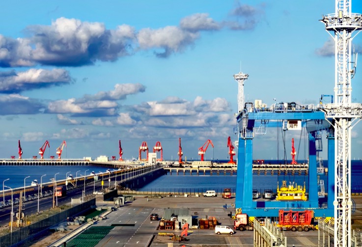 秋日的盐城港,集装箱整齐排列,码头桥机忙碌吊运,车辆有序穿梭,一派繁忙又充满活力的景象。