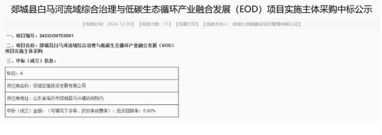 近21亿!山东一流域综合治理与低碳生态循环EOD项目结果出炉
