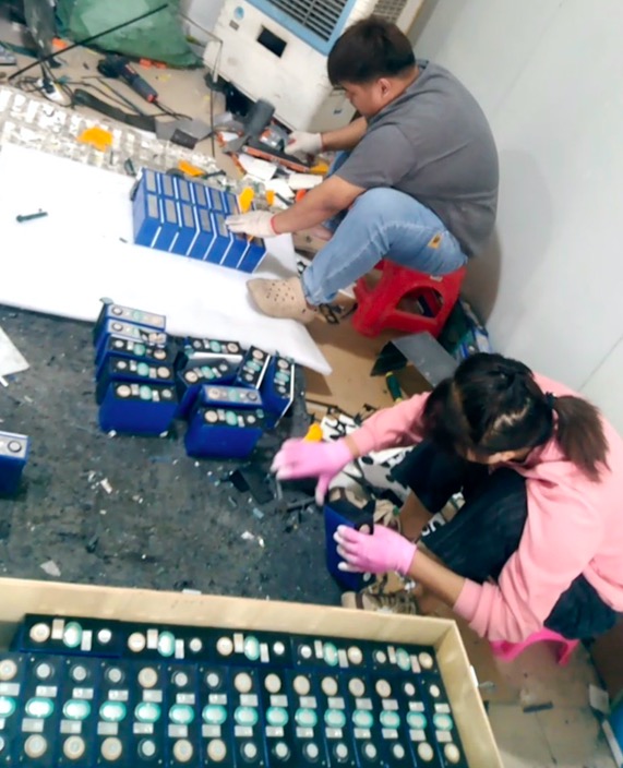 暗访过程中,澎湃新闻记者发现在广东省东莞市的塘厦镇、清溪镇及其周边镇区,聚集着不少退役动力电池回收、处理厂家。在塘厦镇海棠工业园内,在一幢楼的二楼和三楼藏匿着一家电池拆解作坊,有工人正在使用切割机对整块退役汽车动力电池进行切割,没有任何防护措施,另几位工人身着便装正在用榔头敲打拆解电池。记者在现场看到,有一排汽车底盘电池贴有“不合格产品”标签,该工厂的负责人称,这批电池是全新的,因电池存在小问题,就到了他们这里,他们只负责给客户拆解电池,并不管用途,“鼓包的一般的也是用的”,拿来拆解电池的主要分为两类,一类是废旧动力电池,一类是全新的汽车底盘电池的瑕疵品,组装好的电池溯源码还可以自己贴上去。