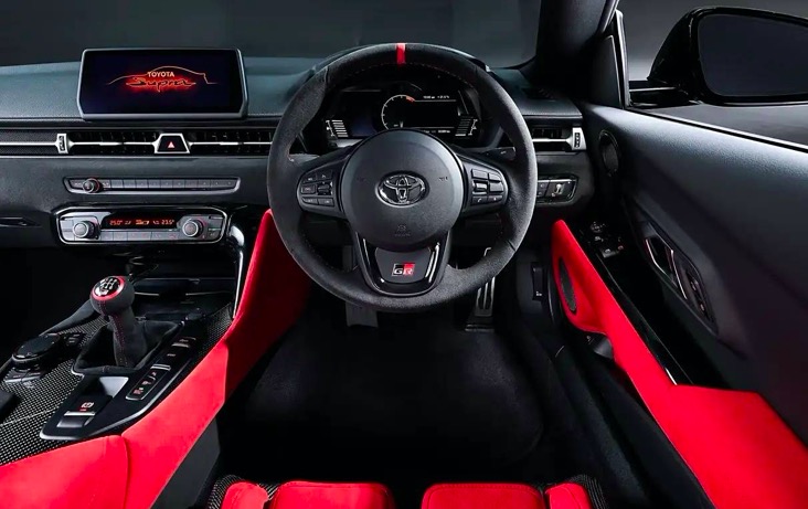 内饰方面,丰田GR SUPRA A90 Final Edition采用全新的碳纤维桶椅,并针对方向盘、车门饰板、手扶箱等处加入Alcantara材质进行包覆。